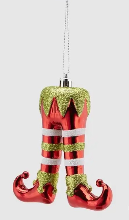 Addobbo in resina colorata e glitterata a forma di calze di elfo.