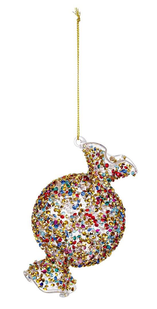 Addobbo a forma di caramella tonda in vetro trasparente adornato da una miriade di cristalli multicolore.