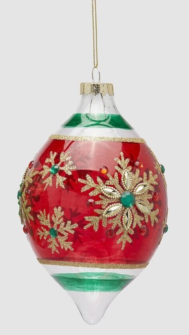Addobbo in vetro trasparente con decori dipinti a mano sui toni del rosso e dell’oro