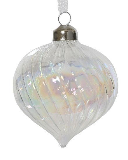 Addobbo in vetro di colore trasparente con effetto iridescente con forma a rapa