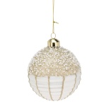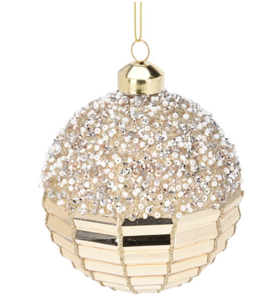 Sfera in vetro di colore oro chiaro decorata nella parte superiore da una miriade di perline color bianco panna.