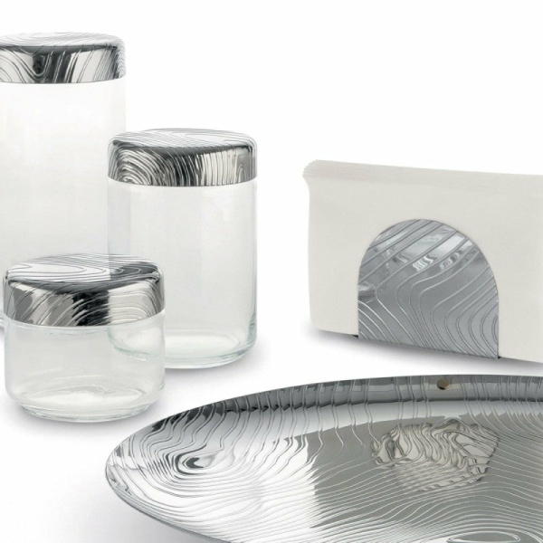 Barattolo ermetico in vetro. Coperchio in acciaio inossidabile 18/10 con decoro a rilievo.Veneer