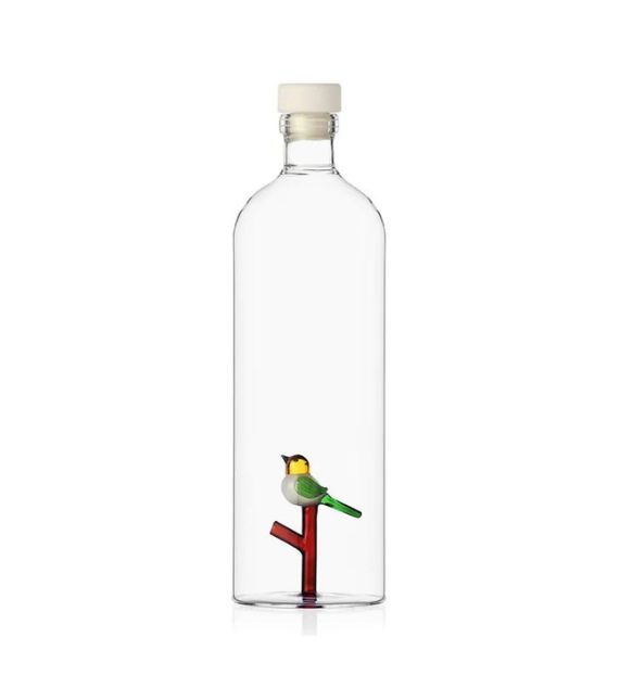 La bottiglia di design della Ichendorf con all’interno una decorazione colorata a forma di uccellino posato su un ramo, appartiene alla collezione Animal Farm.