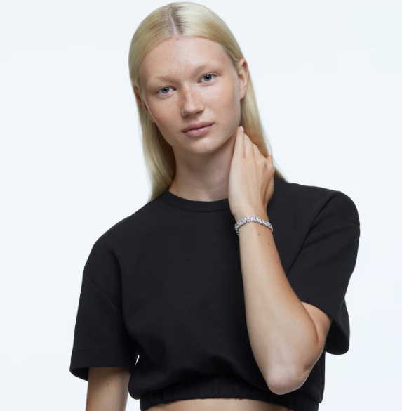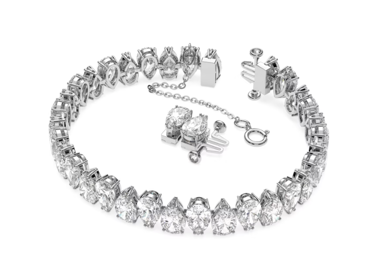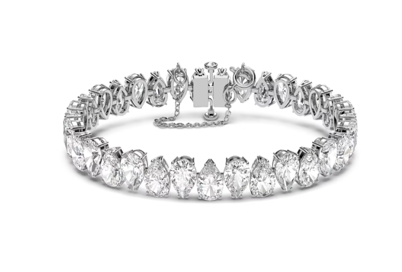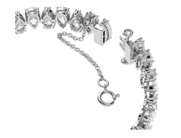 Questo bracciale articolato è raffinatamente lavorato con pietre dal taglio pear su una montatura a griffe placcata rodio e rifinito con una chiusura a scomparsa. Progettato per la fluidità e dotato di una finitura di lusso, questo oggetto si può indossare come nuovo elemento essenziale del guardaroba da solo, oppure abbinato ad altri bracciali della linea Millenia, per ottenere un effetto moderno e spettacolare al tempo stesso. Parte della linea Millenia, questo bracciale è firmato dalla Direttrice creativa Giovanna Engelbert per la Collection II. Come chiuderlo e aprirlo: far scorrere i ganci nei corrispondenti fori alla base dell’ultimo cristallo e premere per incastrarli. Fissare la catena di sicurezza utilizzando la piccola chiusura a leva. Per aprire, sganciare la catena di sicurezza e premere contemporaneamente i pulsanti su entrambi i lati della pietra per rilasciare i ganci.