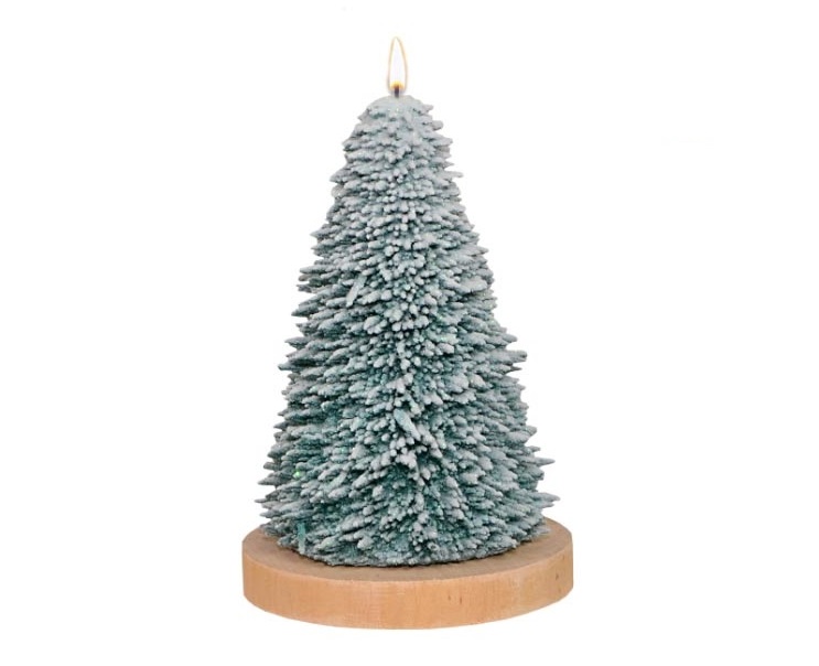 Candela a forma di abete innevato. Una candela pregiata dalle finissime fattezze, singolarmente confezionata.
