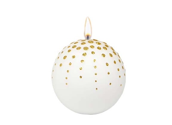 Candela tonda di colore bianco opaco con pois glitterati oro
