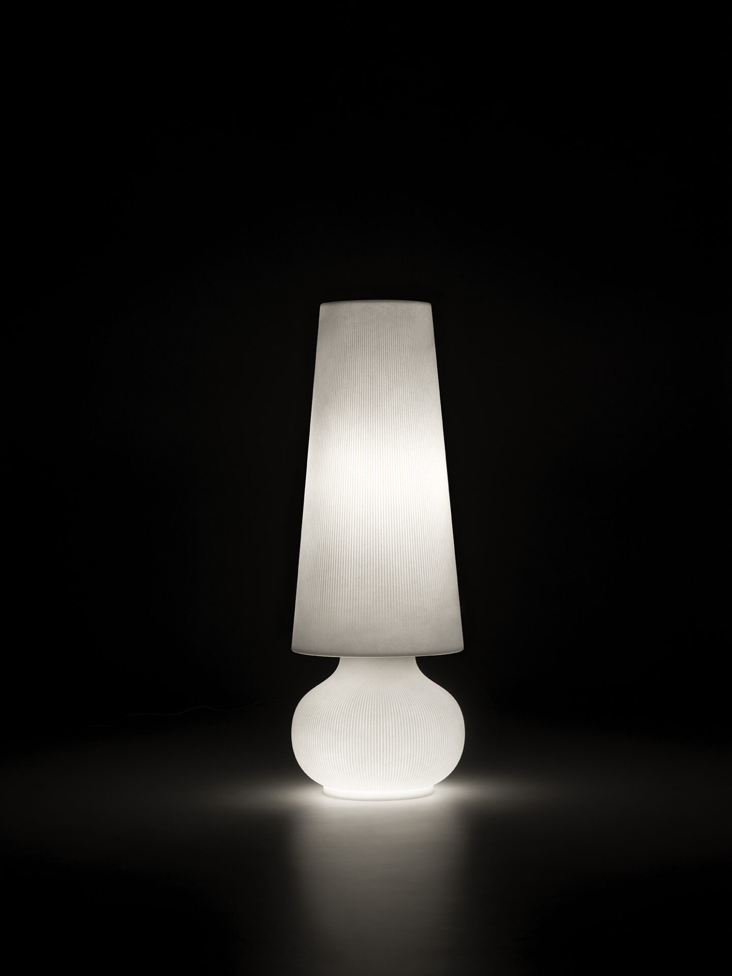 Lampada di grandi dimensioni dalla presenza scultorea a dalla superficie rigata, che restituisce un singolare effetto di luci e ombre.