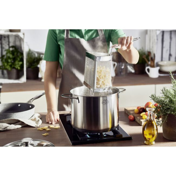 Il solo pensiero della pasta fresca ti fa venire l’acquolina in bocca? Allora troverai la pentola per pasta BALLARINI semplicemente fantastica. La pentola di alta qualità ha una capacità di 8 litri ed è dotata di due inserti scolapasta. Questo permette di cucinare diversi tipi di pasta con diversi tempi di cottura contemporaneamente nella stessa pentola. Non appena la pasta è al dente, viene semplicemente tirata fuori dalla pentola della pasta nel colino e l’acqua si scola automaticamente. Ora si può gustare la pasta immediatamente. Poiché la pentola per la pasta è in acciaio inossidabile 18/10 e ha una base a sandwich con anima in alluminio, si riscalda molto rapidamente e in modo uniforme. È adatta all’uso su piastre a induzione e la finitura satinata di facile manutenzione della pentola la rende persino lavabile in lavastoviglie. Auguriamo a te e ai tuoi amici buon appetito!