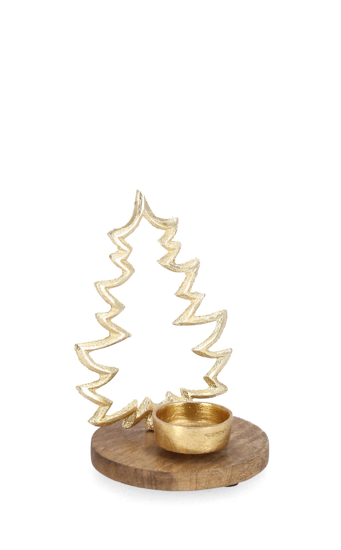 Portacandela a forma di abete in metallo dorato e base in legno di mango.