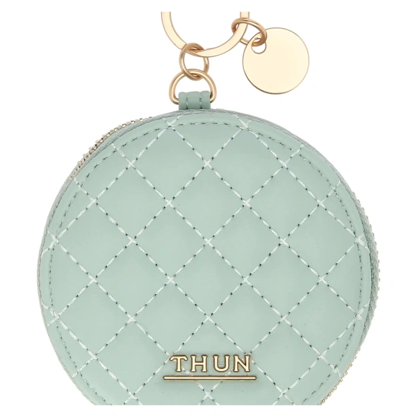 Il portachiavi da donna rotondo con zip in ecopelle verde è un accessorio pratico e sofisticato. La zip permette di custodire piccoli oggetti con sicurezza, mentre la finitura trapuntata aggiunge un tocco di eleganza. Perfetto per organizzare la tua borsa con stile, è un dettaglio raffinato che unisce funzionalità e design.