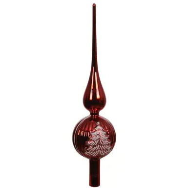 Puntale per albero di Natale in vetro di colore rosso lucido con decoro di abete bianco