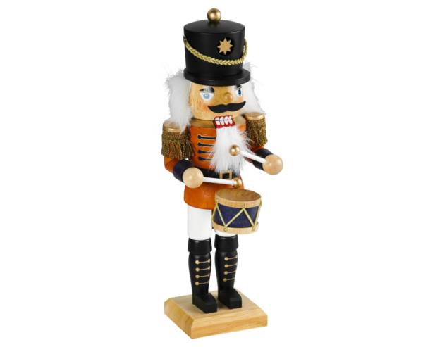 Schiaccianoci in legno tradizionale che reca in mano un tamburo.