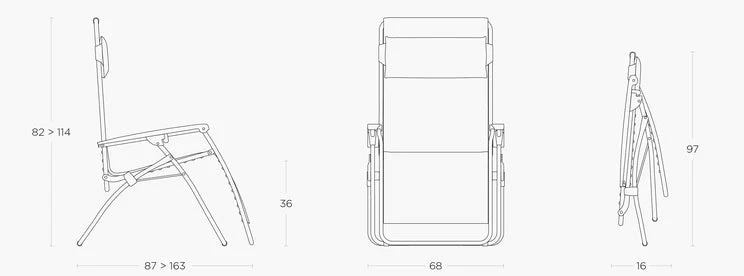 - Tela: Batyline® ISO. Tela removibile e sostituibile con fissaggio tramite clip in elastomero (brevetto LAFUMA MOBILIER).