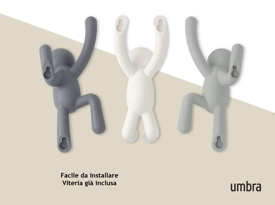 Questi 3 ganci da parete riproducono la mascotte Buddy di Umbra che si arrampica sul muro in varie posizioni. Quando non vengono utilizzati come ganci, fungono da complemento d’arredo spiritoso e originale e fanno sicuramente parlare di sé. I ganci da parete Buddy rappresentano un accessorio perfetto per l’ingresso e una simpatica alternativa salva spazio al classico attaccapanni. Realizzato con plastica riciclata.