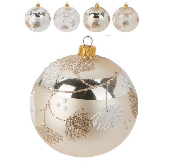 Sfere in vetro in 4 versioni assortite con decoro a ramo glitterato