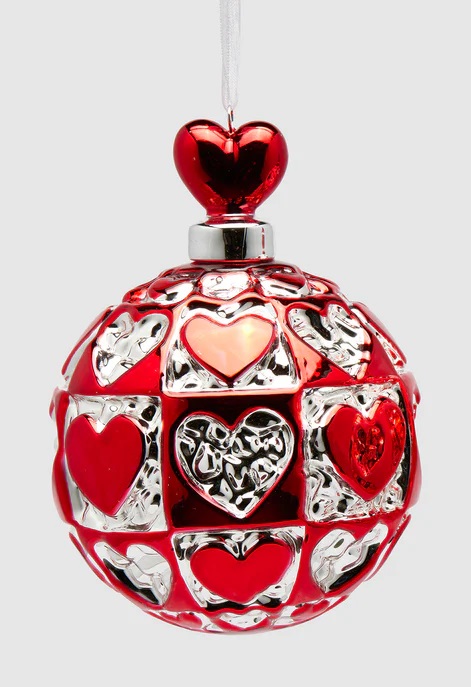 Pendente a sfera in vetro decorata con cuori rossi e argento e piccolo cuore rosso nella parte superiore