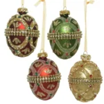 Sfere in vetro in due colori assortiti (rosso, oro) e due formati diversi (a righe o a strisce), decorati con perline.