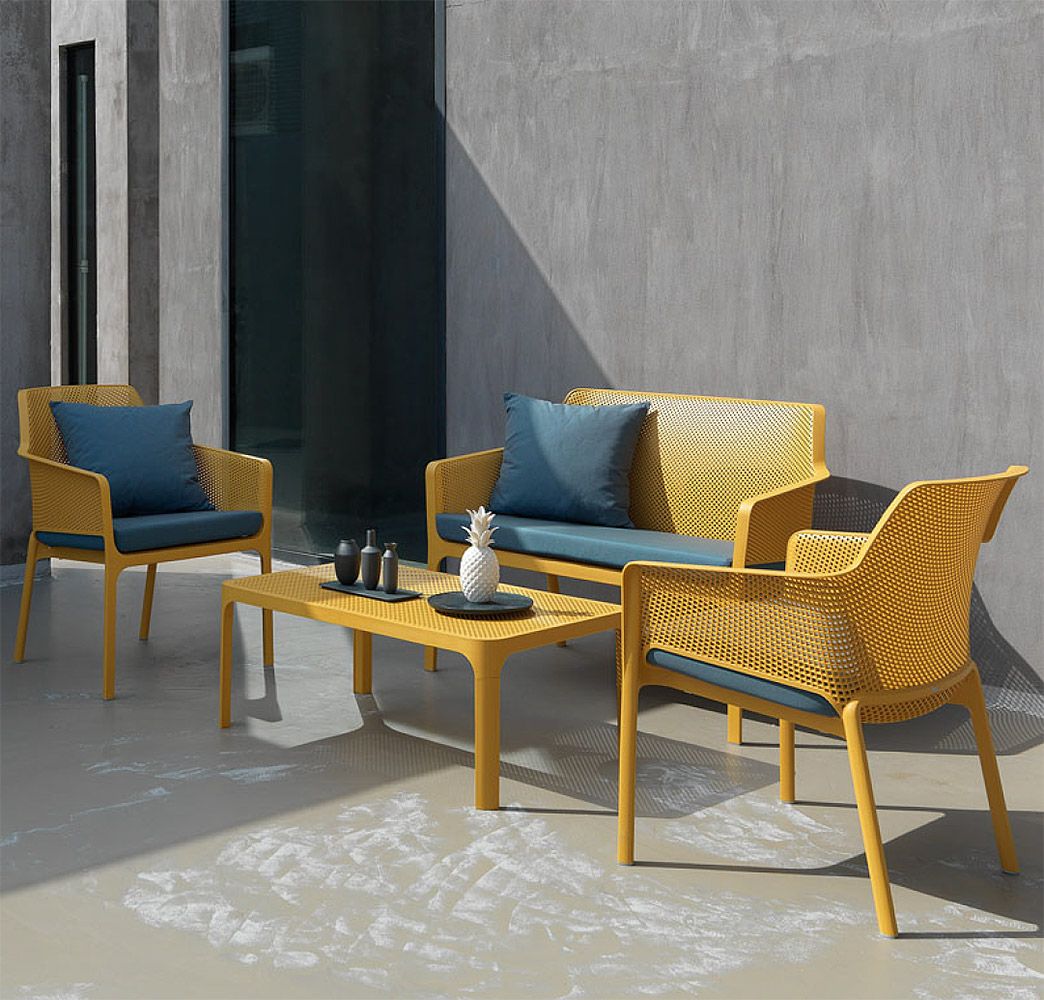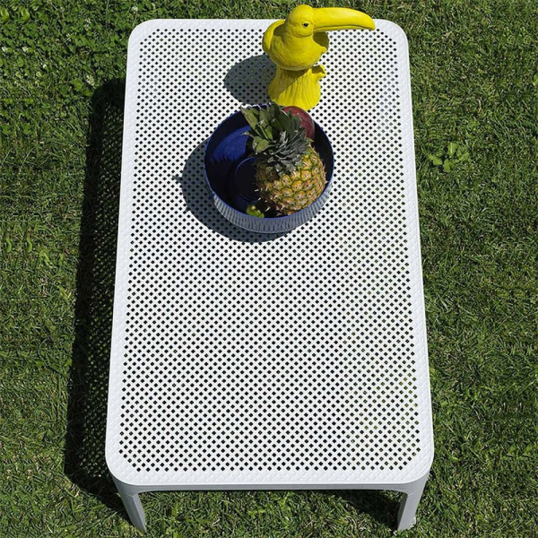 Tavolo basso. Polipropilene fiberglass trattato anti-UV e colorato in massa. Finitura opaca. Dotato di piedini antiscivolo. Resina riciclabile.