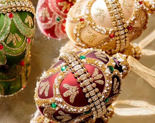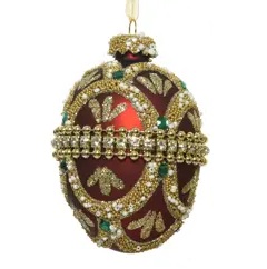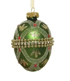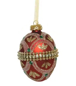 Addobbi a forma di uovo assortiti in 4 colori: rosso, bordeaux, oro, verde. Riccamente decorato con gemme e perline, un nastro di organza per assicurarl0 all’albero, ogni uovo è un capolavoro.