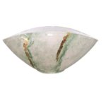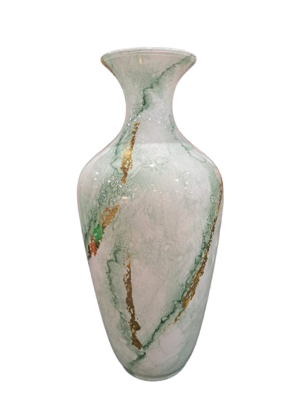 Questo elegante vaso in vetro David è stato disegnato e decorato in Italia con una combinazione di verde e oro.